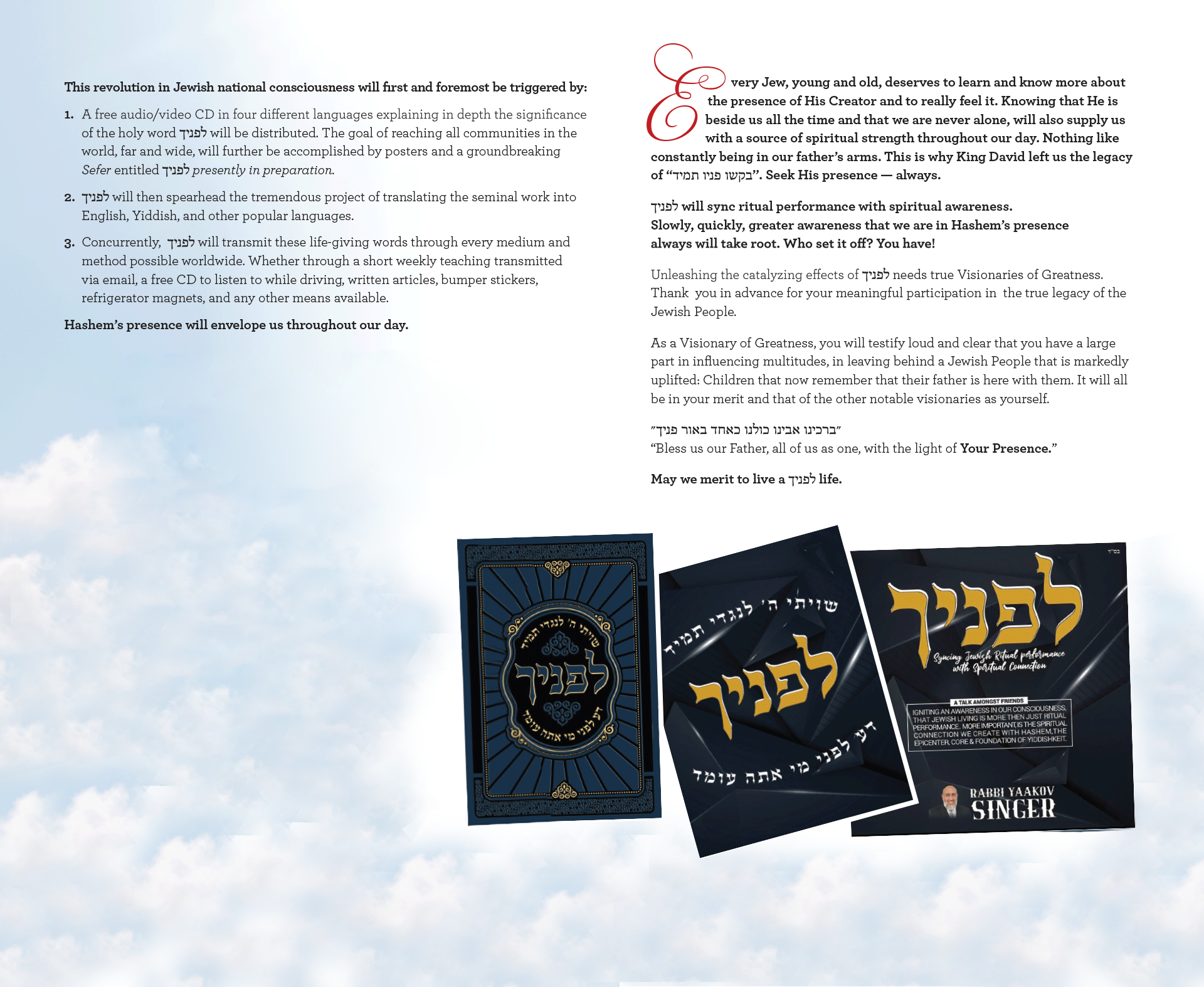 Here you will find an important inspiring life changing shiur, that deals with the unknown significance of the code word לפניך. The teachings shared here, have the power to change our spiritual lives forever and help us connect to Hashem, like never before. Roshei Yeshiva, Chassidic Rebbe’s, Rabbonim have been captivated by this message. They are urging everyone to listen, learn and internalize these spiritual teachings and to spread them to Jews everywhere. These insights have the power to improve our relationship with Hashem; HOW we serve Him, HOW we study Torah, HOW we perform Mitzvos, HOW we Daven, and HOW we conduct our daily affairs. Being aware of Hashem’s presence, knowing that we are always in His presence and feeling Hashem's presence everywhere, all the time, will motivate us to spiritual heights never imagined possible before.